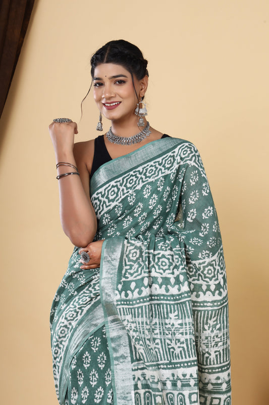 Srishti Textile Greenish Cyan Linen Saree with Stylish Print