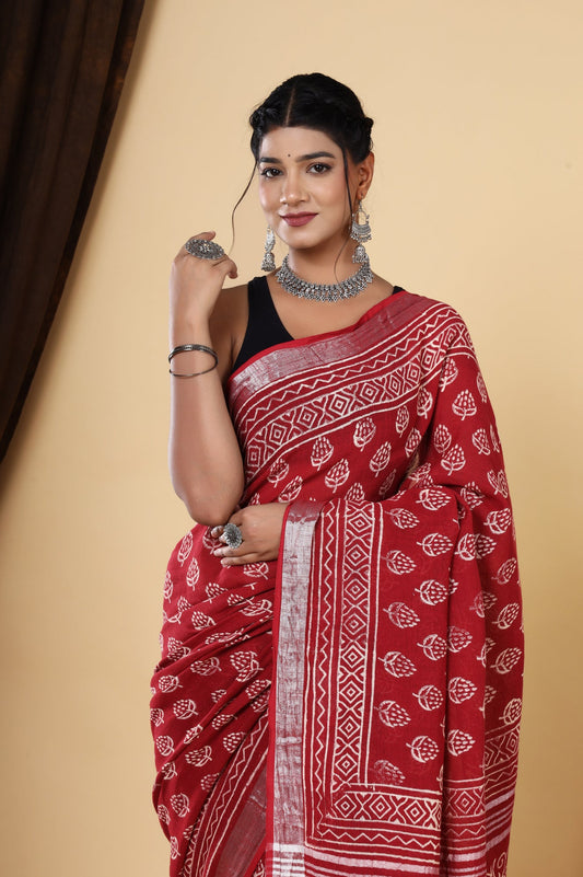 Srishti Textile Red Linen Saree with Booti - Elegant Design
