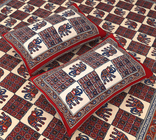 Jaipur Majesty: King Size Bedsheet with Chokda Elephant Print in Red