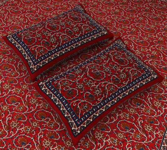 Jaipuri Blooms: King Size Red Kalamkari Floral Bedsheet