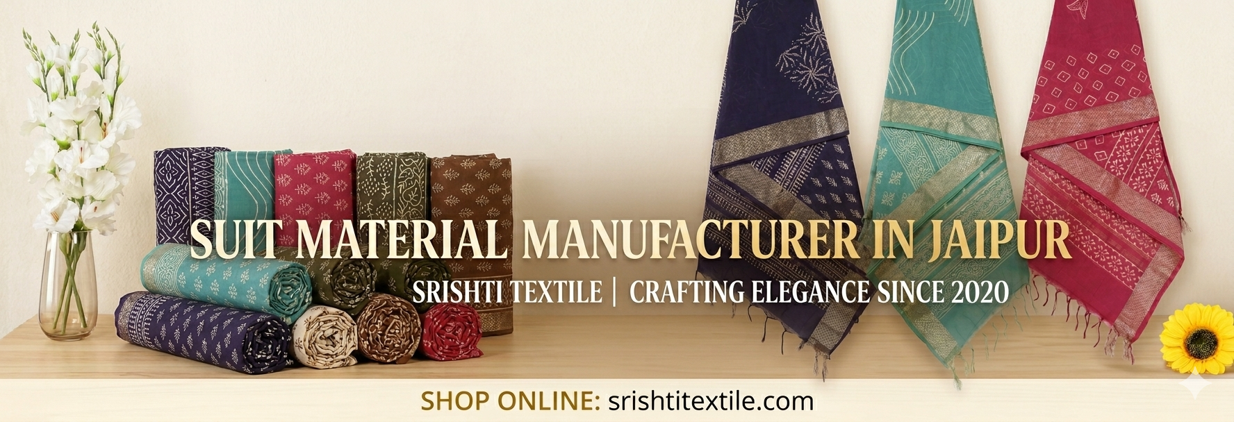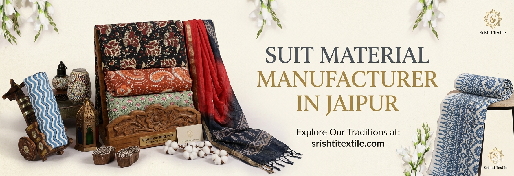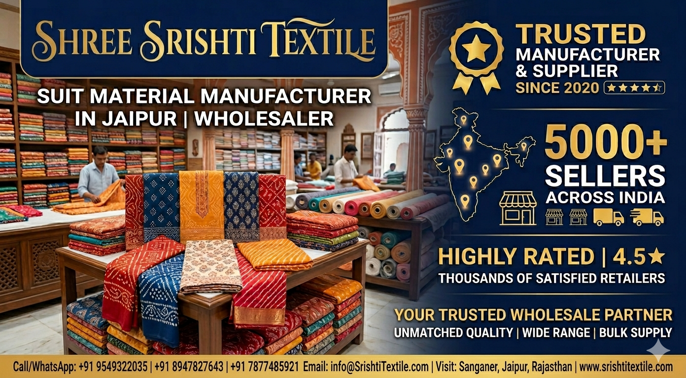 Check Bulk PriceWelcome to Shree Srishti Textile — a direct manufacturer in Sanganer, Jaipur since 2020. We supply boutiques, resellers, and export houses with authentic jaipuri cotton dress materials, unstitched suits, Kota Doria, Mulmul, Chiffon, and Chanderi Silk sets at wholesale price from ₹400/set. No middlemen. Factory-direct quality.